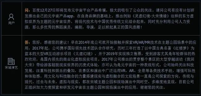 宋城演艺:正组织加大力度探索和研发元宇宙在主题公园和现场演出中的应用
