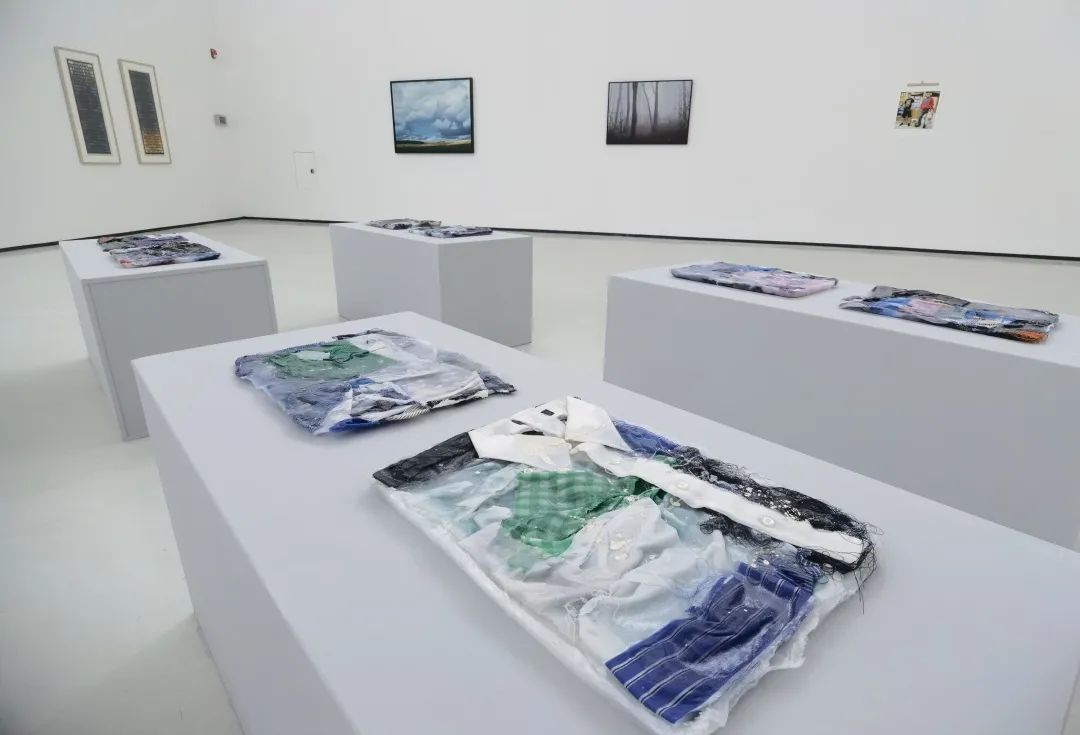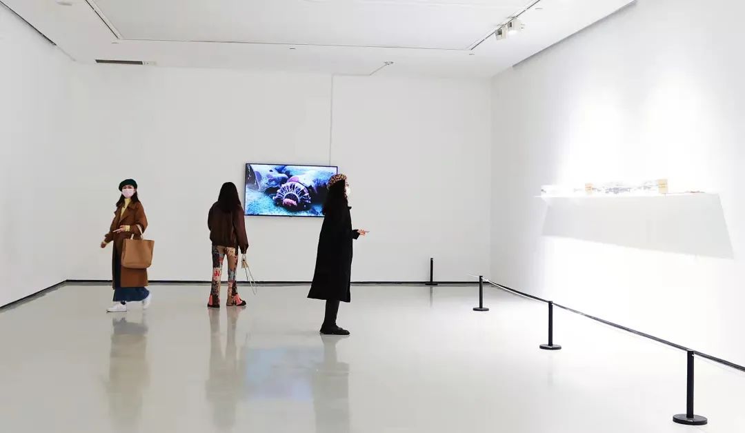 迎面墙上庞茂琨教授的作品《折叠》表现出中西文化符号的折叠,反映出经典艺术的光耀永远吸引着我们,同时又逼迫着我们无法靠近她,我们不得不重新找到自己的栖息之地,筑构自己的能源之巢。而在亚瑟·沃森的作品《两次潮汐》中,我们看到了艺术家对于对苏格兰东北部本土文化的不间断的兴趣,以及对于口口相传的和材料的纪录,这些文化似乎处于传统现代社会的边缘,但其传统、仪式和信仰与当代艺术实践的各方面相连。“融合”在此表明这样一种看法:当代文化中的传统不再总是遵循着线性发展逻辑到达当下。毋宁说,当代语境下的传统往往是某种“折叠”的结果,它仿佛是通过时空的跃迁瞬间出现在我们的眼前。