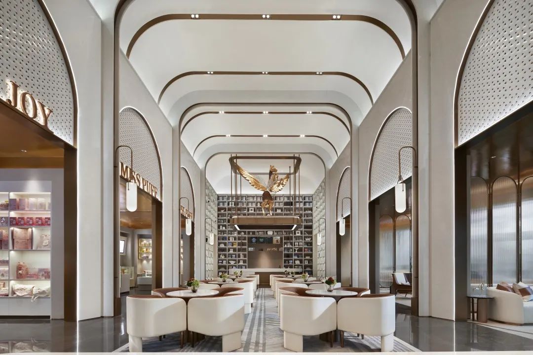转入长长的连廊,天花设置星光灯,地面安装埋地灯,以“光”为媒介,步入画境,在光影共舞之间开展一场唯美的秀场与序章。
