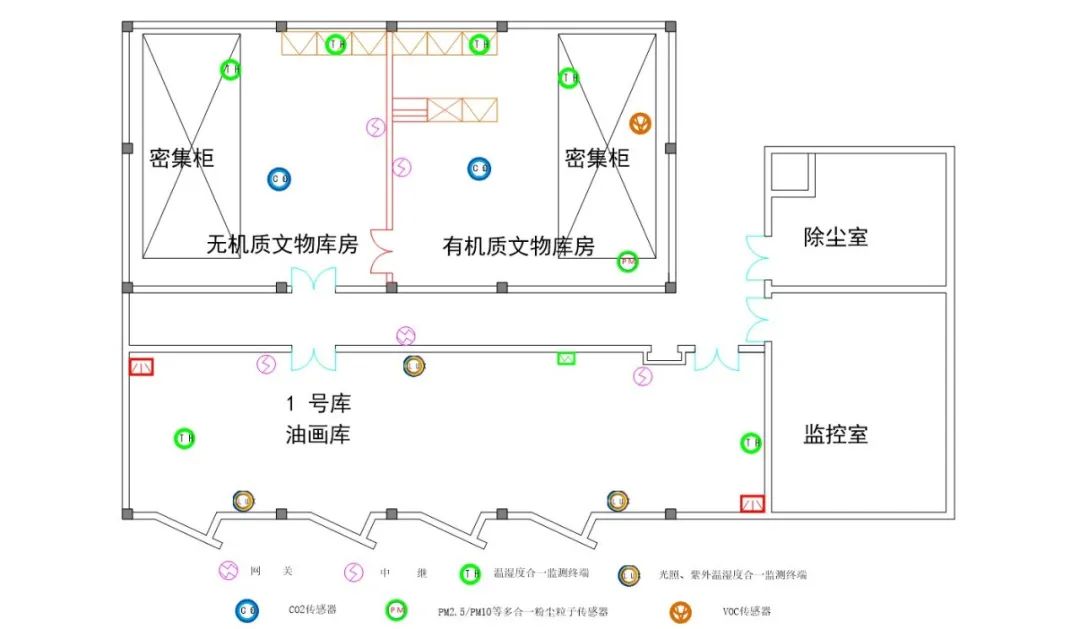 布点监测设备。实行展厅和库房区域无线网络全覆盖,保障无线环境监测终端能采集和传输数据信号;对珍贵文物重点布局,布放监测设备。
