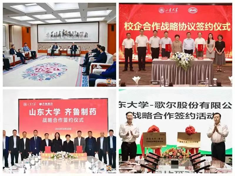 落实《推动产教融合、构建院企合作社会服务体系行动计划》。与京博集团、华熙生物、齐鲁制药、凤凰网山东、新安化工、歌尔股份、比亚迪、中铁十局、中铁十八局、国网山东电力、徐州地铁、鲁南制药、福瑞达、中航济南特种结构研究所、泰山体育、保龄宝、中国联通等签署合作协议。统筹推进相关学院与中建八局、山东重工、中广核、中科院空天院齐鲁研究院等展开深入合作。与中行山东分行、工行山东分行、建行山东分行、农行山东分行、招商银行等围绕校庆系列活动和学校事业发展,签署合作协议。完成国家示范性软件学院服务山东重大项目集中签约和微生物技术国家重点实验室两次重大项目集中签约。