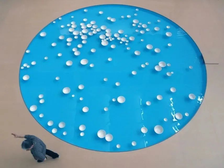 这件作品名为《微偏v3》(Clinamen.3),是法国艺术家 Celeste Boursier-Mougenot 创造,将数百个圆润饱满、晶莹白透的瓷碗,以大小高低各不相同的姿态漂浮在蓝色水池中。随着池水的循环流动更迭,瓷碗在其中轻轻地游动、旋转、漂流,并在与其它瓷碗轻轻碰撞时,发出清脆温柔的响声。在空旷的美术馆里,回声阵阵,如天籁一般空灵。