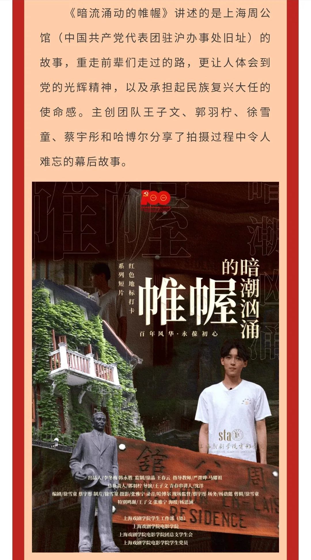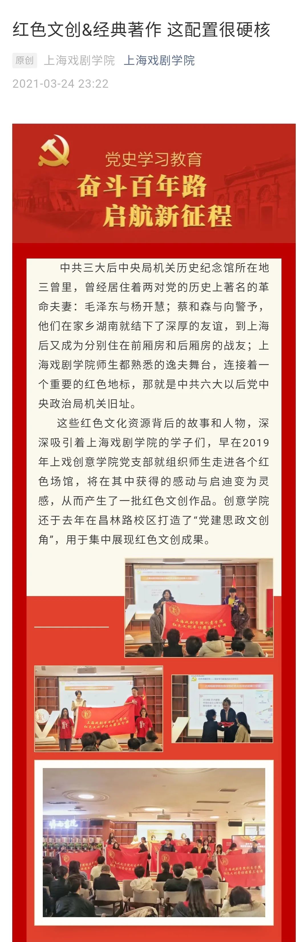 上戏积极利用红色资源,动员学生走进各个红色地标,通过红色寻“宝”、红色场馆Vlog打卡、红色纪念地短视频创作等,以青春话语诠释党的初心使命。