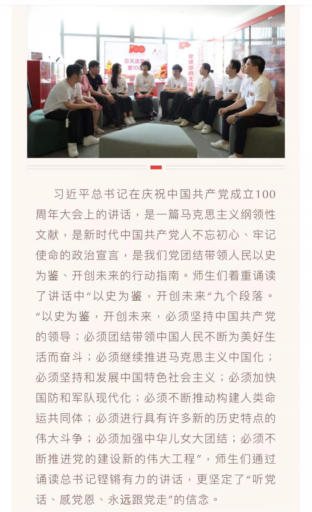 “百天读百年”活动,是学生学党史读党史讲党史的一种创新形式。2021年7月1日,部分学生党员在党员教师的带领下,第一时间学习了习近平总书记在庆祝中国共产党成立100周年大会上的讲话。