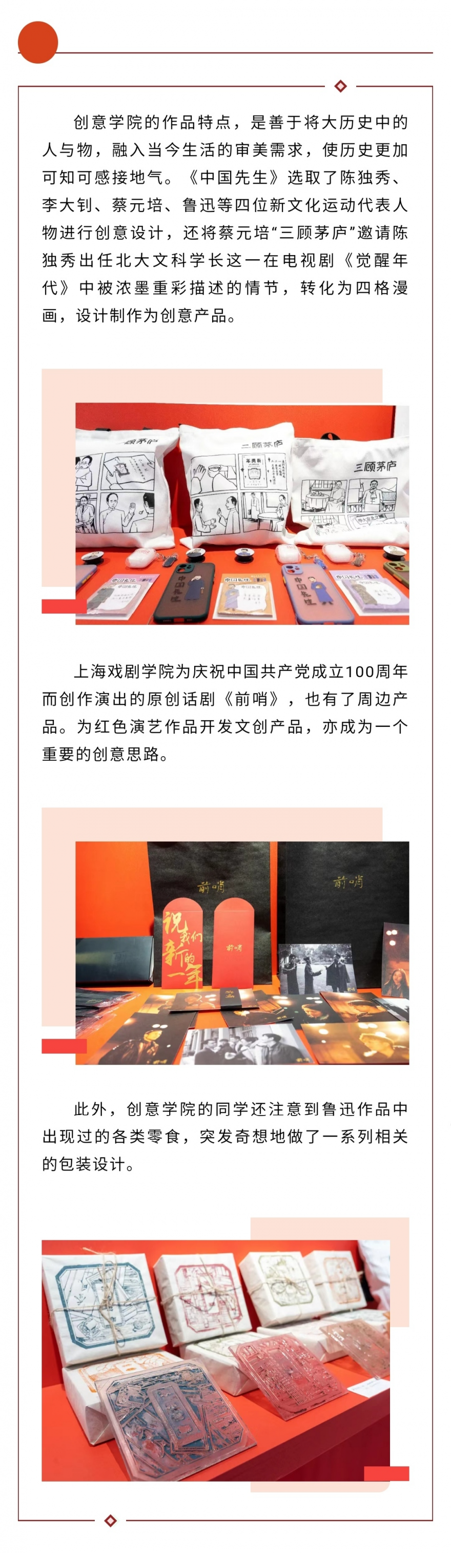 结合创新创业活动和大学生实践基地建设,在庆祝中国共产党成立100周年之际,上戏举办学生红色文创大赛及作品展,红色文创再次点亮校园。