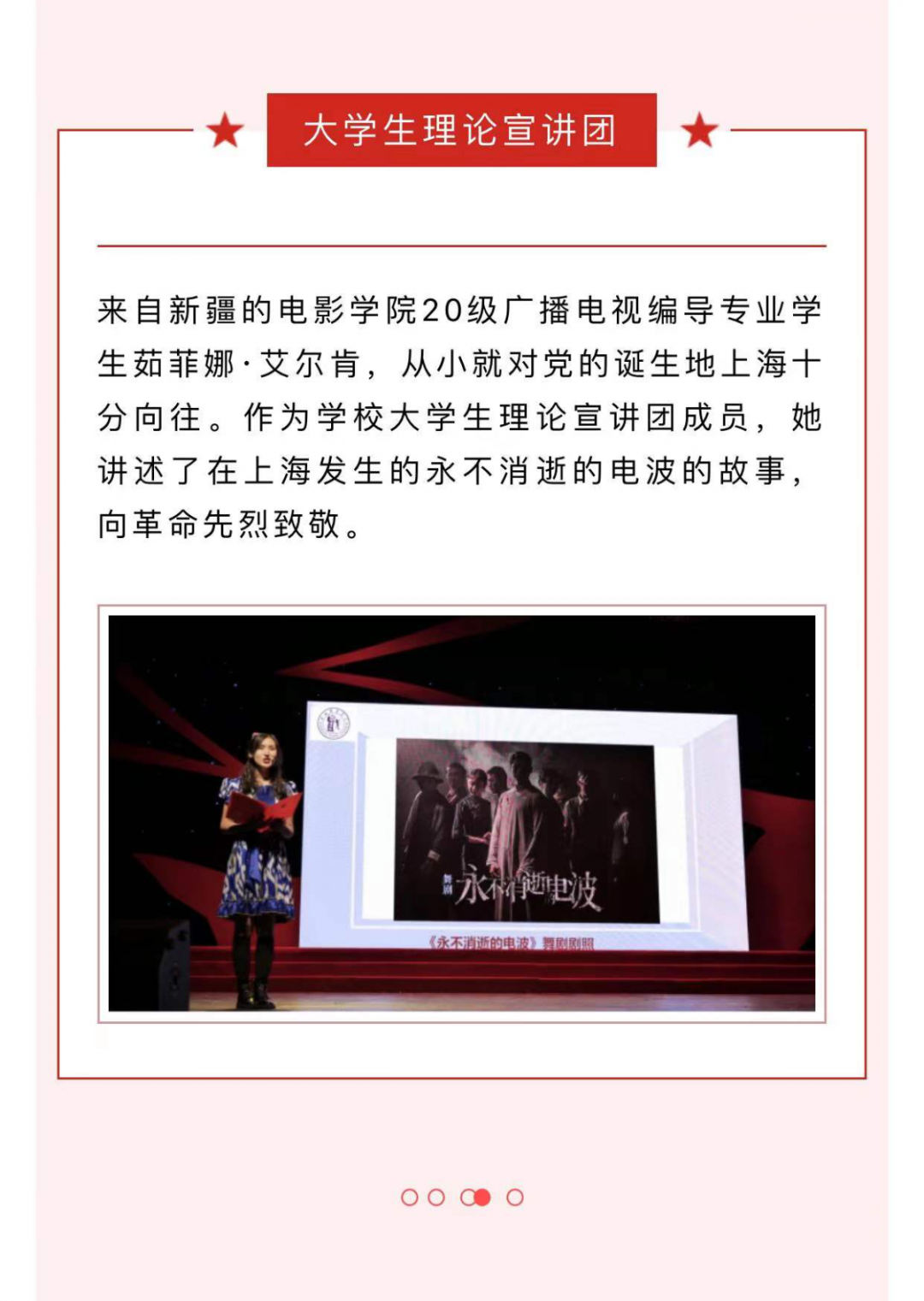 上戏学生理论宣讲团,通过多种途径进行党史宣讲。学生们分别获得上海市大中小学生讲好党史故事英语演讲比赛一等奖;2021年上海高校习近平新时代中国特色社会主义思想大学习领航计划系列主题活动二等奖;上海团员青年学习习近平新时代中国特色社会主义思想演讲比赛三等奖;跻身团市委“学党史、强信念、跟党走”微团课大赛市级决赛;来自新疆的少数民族学生的微党课进入上海市高校理论宣讲微课程市级决赛。