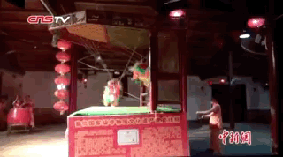 狮子的动作神态全部由鼓乐声的轻重缓急来决定,鼓手敲打最快的时候,就会出现标志性动作——天外飞狮。