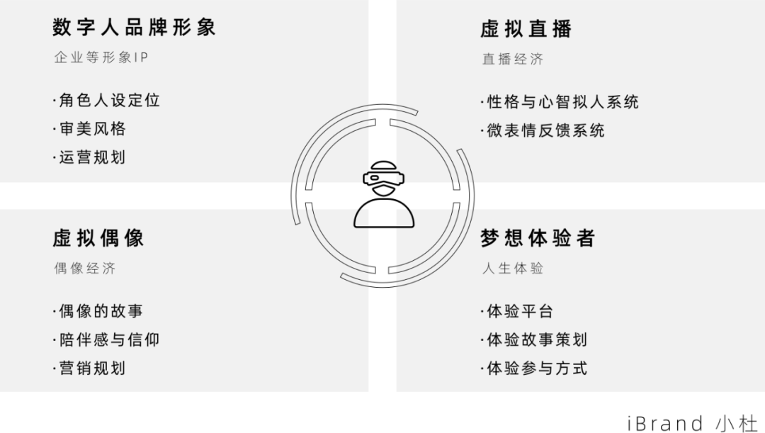 数字人的具体应用场景极其丰富且充满了无限的扩展可能。本文选取数字人品牌形象、虚拟主播、虚拟偶像与梦想体验者四个领域来简略介绍数字人较为前沿的应用方法。