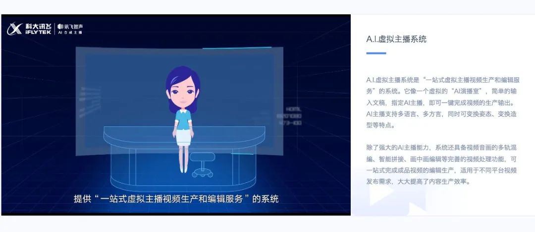 A.I.虚拟主播解决方案,利用讯飞的语音合成、人脸建模、形象驱动、图像处理等多项人工智能技术,实现了文本到视频的自动输出,并支持主播多语言视频生成。更多请查阅#元宇宙·跨学科知识库