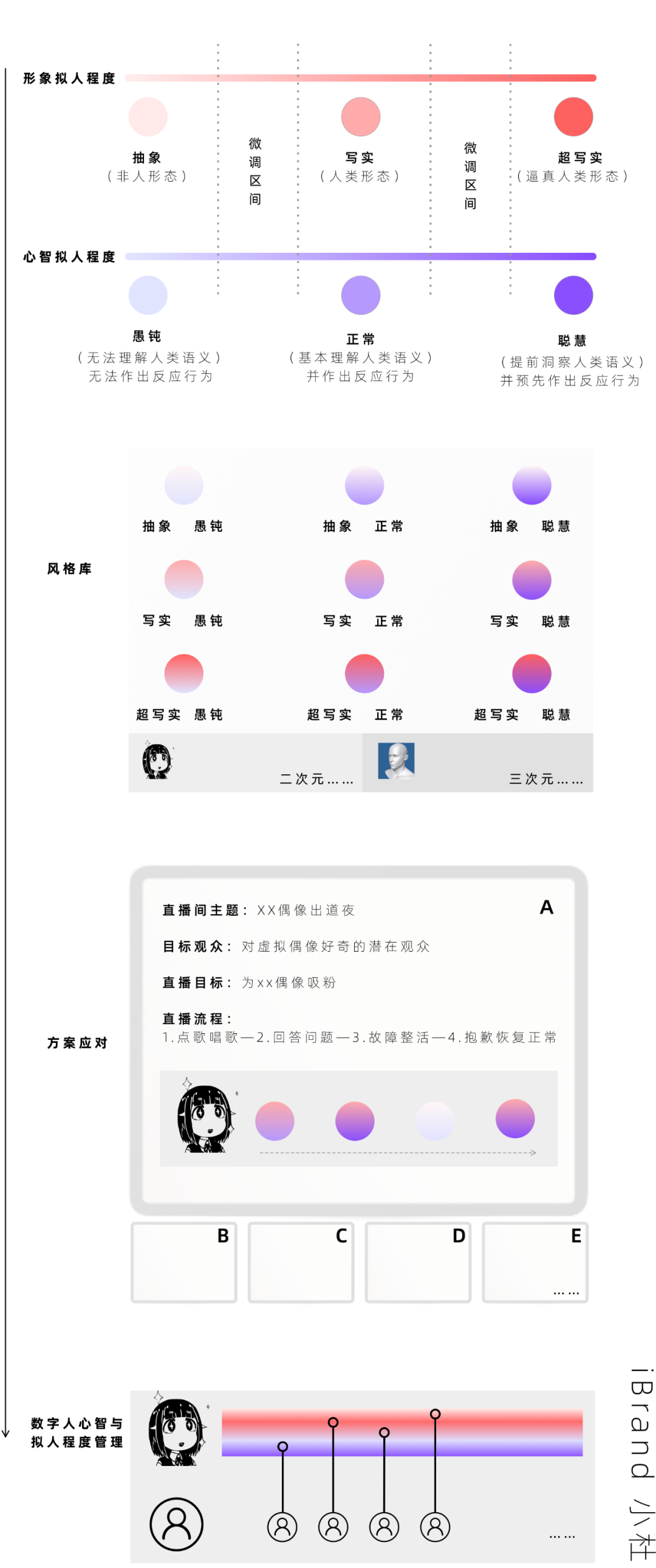 对于数字人品牌形象应用,考虑绝大部分代言品牌形象的稳定一致性需求,选定心智、拟人程度设定与风格终端呈现模式后,便不易大幅度变化改动。在此基础上进行文案策划与用户接触点设计,最后利用数字人动态宣传与用户接触的优势,争取更大的商业效益。数字人虚拟主播与偶像,较于品牌形象营销会复杂许多。与真实人物类比,真人明星代言业务较为稳定单一,不可控因素极少。而真人偶像与直播,各种演出本职业务、八卦新闻、“整活”意外、甚至引战操作与意外塌房,都是其营销管理的一部分。数字人虽说一切设定皆在背后营销团队的控制管理中,但若不在一条长时间轴中丰富其设定特色,并适当对内容输出风格作出调整,数字人对于观众的吸引力与流量变现能力便不能始终维持。这便要求运营团队需提前做好每一场表演,甚至于一段时期行程的心智与拟人态管理。当流量与观众吸引力发生波动时,要及时调整状态,随时抓住关注的好奇心。而梦想体验者则更为开放自由。若用户想体验异世界生物或者修真的生活,数字人替身便是抽象与非人智态的;若用户想体验太空探索等真实,或基于真实的科幻场景体验,数字人便是超写实与聪慧的。无论什么情景,数字人心智与拟人态风格都能在预设好的库中找到最优解,而不是“恐怖谷”般智能的崩坏,或是“滑稽人工智障”般地惹恼用户。