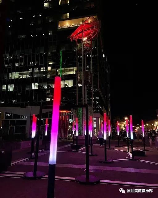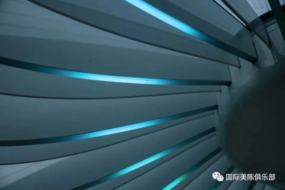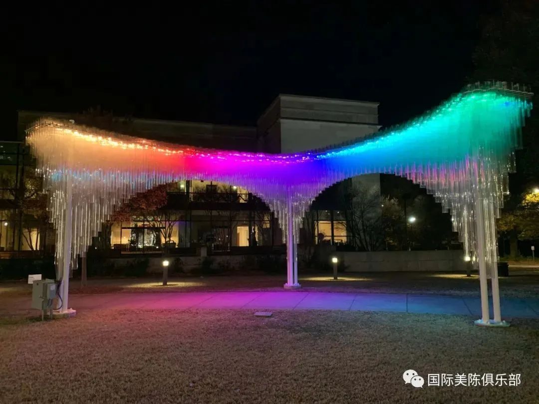 这件精美的装置艺术作品由1,200个直径5英寸的透明聚碳酸酯管和800个全彩LED灯组成,排列在一个六边形的蜂窝网格上,被悬挂在30英尺乘30英尺的拱廊中,像张开的双臂在热情欢迎前来体验的游客。