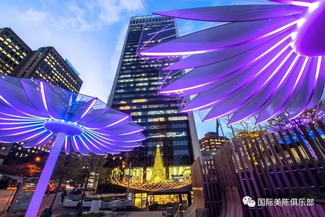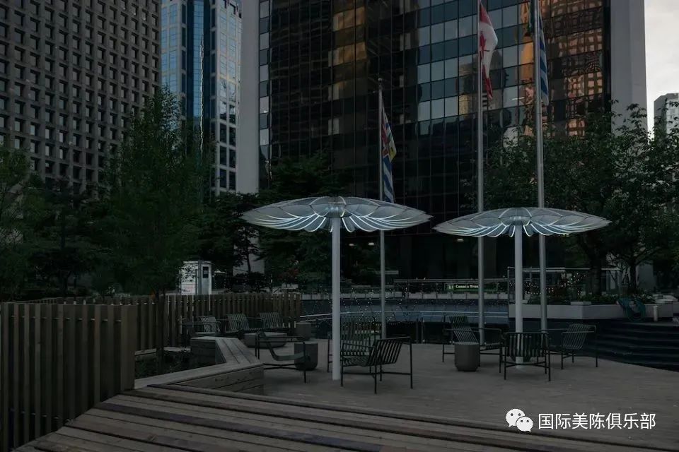 《Parasol》安装在新的 Dunsmuir 广场上,靠近 Dunsmuir 和 Burrard 的交汇处,对面就是轻轨站。 它们周围环绕着由 Hapa Collaborative 设计的全新波浪形木质座椅区和景观。
