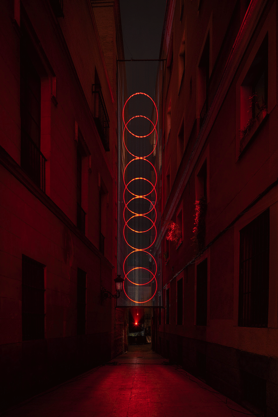 这场名为“Data”的灯光装置作品是SpY为今年马德里国际灯光节所做的,它最大限度地利用了城市夜间景观的一部分,营造出身临其境的视听体验。通过这种身临其境的视听格式,SpY探索了新的工具,如全息织物,为画面赋予一种令人惊讶的失重感。这种织物制成的15米高的全息屏幕安装在马德里两座建筑物之间,为观众创造了一种身临其境视听的体验,他们可以沿着街道漫步,欣赏两边的艺术作品。