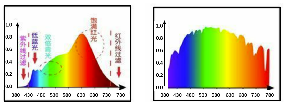 LED光谱(左)太阳光谱(右)