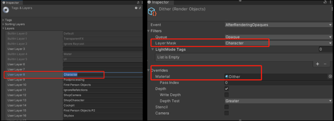 这样设置也就意味着,Dither Renderer Feature 仅在角色的深度值(深度值的范围在0~1之间,值越小表示越靠近摄像机,值越大表示越远离摄像机)大于另一个物体的深度值(也就意味着角色位于另一个游戏对象后面时)才使用材质渲染角色。