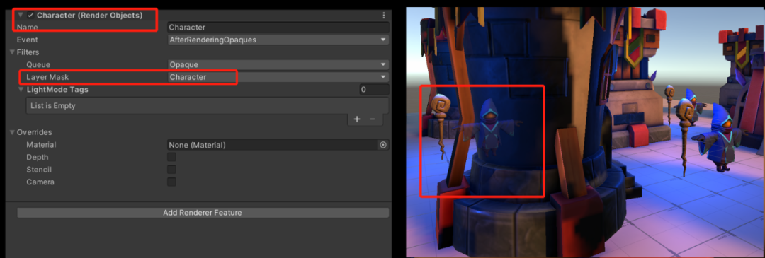 这个案例里我们实现使用了两个 Render Object Renderer Feature:一个用于绘制位于场景中其他游戏对象(如建筑)后面的角色部分,另一个用于绘制位于场景中其他游戏对象(如建筑)前面的角色部分。