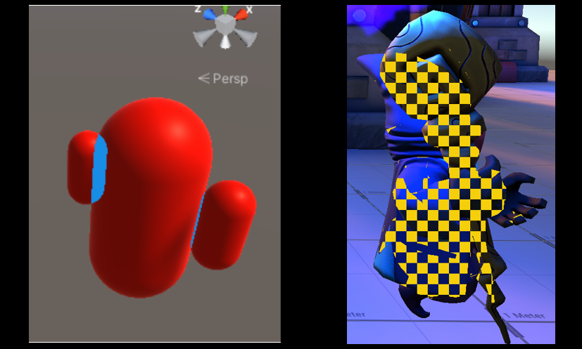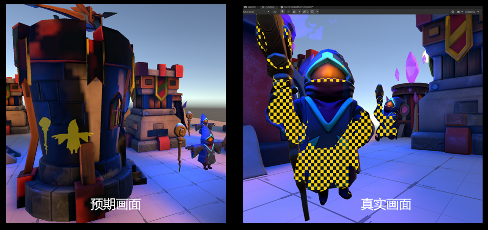 但是现在我们遇到一个问题是:因为角色的某些部分也会遮挡角色本身。所以 Dither 材质会替换角色的某些部分。如下右图所示。这不是我们预期的结果。
