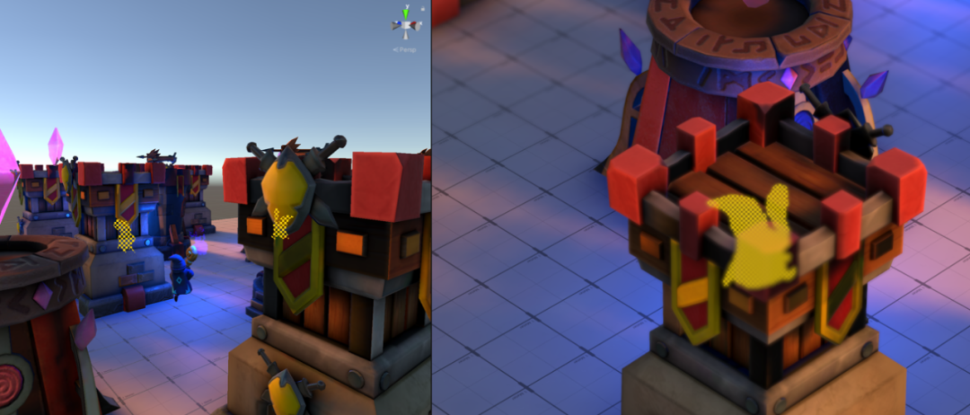到这里的话,当角色在建筑 GameObjects 之后时,Unity 会使用 Dither Material 绘制角色轮廓的效果就已经完成。