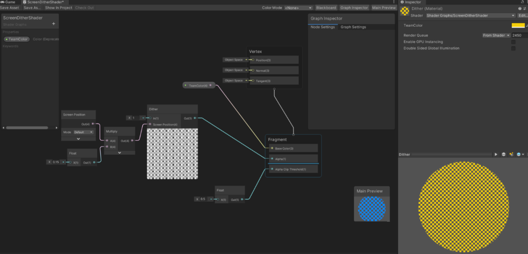 接着创建一个材质 Dither,并使用 Shader Graph 创建一个屏幕扰动的 Shader,并将其命名为 ScreenDitherShader。颜色我设置为黄色,把这个 Shader 赋给这个材质 Dither,当角色位于 GameObject 后,我们后面会用 Renderer Feature 调用这个材质 Dither 去替换角色本身的材质 MAT_Mage_Blue。