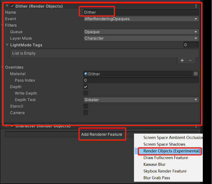 首先我们选择之前创建的 UnityOcclusionRenderer,在 Inspector 中,单击 Add Renderer Feature 并选择 Render Objects。选择名称字段并输入新渲染器功能的名称 Dither(因为在建筑背后,角色表现出扰动的效果所以名字命名为Dither)。