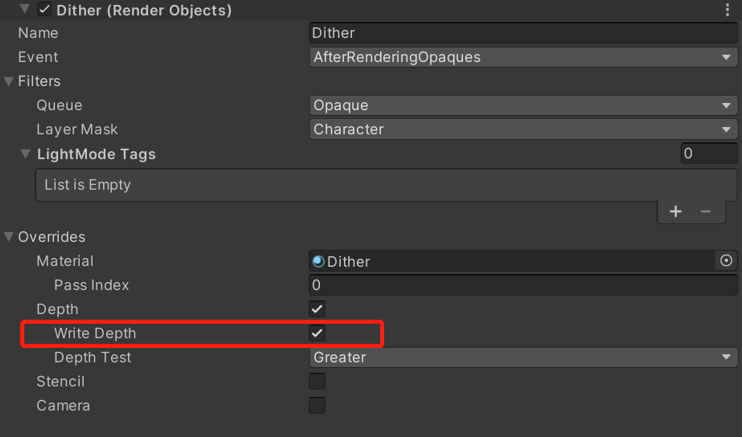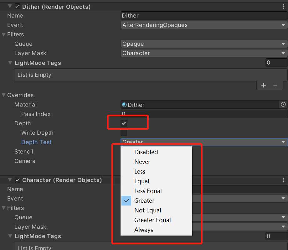 我们的预期效果是仅当角色位于其他游戏对象之后时,Dither Renderer Feature 才使用 Dither 材质渲染角色。所以我们要进行深度检测 Depth Test (深度信息是用来决定哪些像素离摄像机更近,我们这里使用深度测试DepthTest来决定当前像素是否被绘制),我们勾选“Depth”复选框,并将“Depth Test 深度测试”属性设置为“Greater”(大于)。
