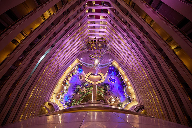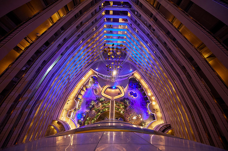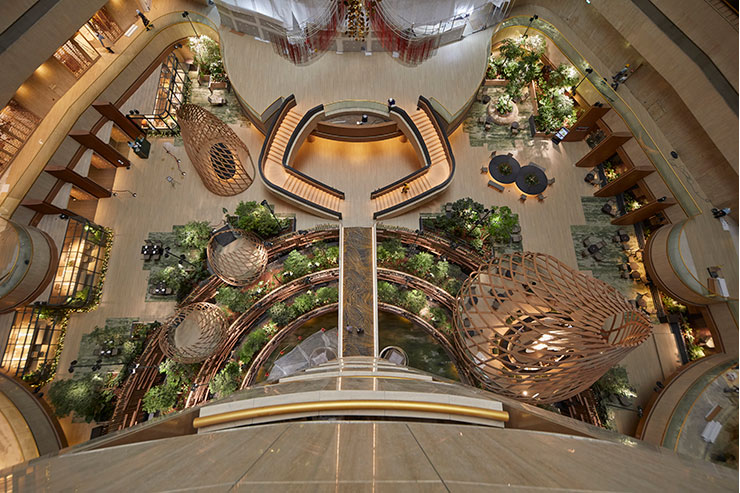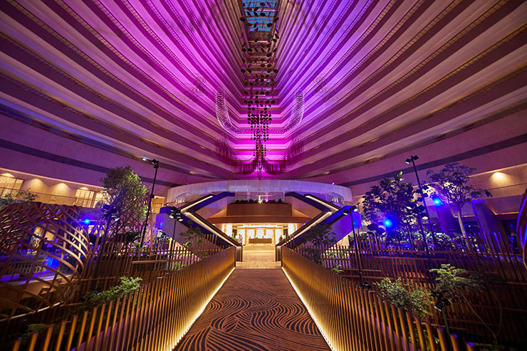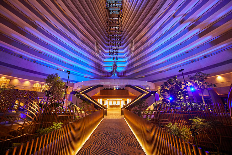 2分半钟的灯光秀表演每小时7点,晚上8点,9点将花园中庭转变为晚上的新光景。从花园景观过渡到光和声音的未来主义景观,通过建筑师约翰·波特曼(John Portman)令人印象深刻的中庭空间,美国雕塑家理查德·利波德(Richard Lippold)的悬挂雕塑Orchidea以及FDAT和Ramboll Studio Dreiseitl新改造的内部花园景观,带出现场建筑元素的艺术俏皮性。