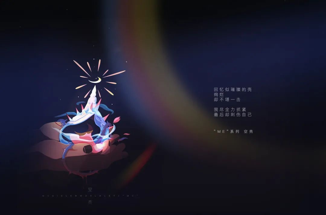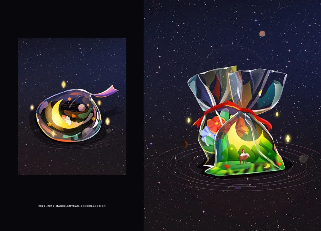 因为插画完全是我自己摸索着学习的,没有系统性的报课,对于风格这块,起初也是挺迷茫的。后来,我就给自己定了一个方向,因为我从小就喜欢亮晶晶的透明质感的物件,喜欢看魔幻题材的电影或者书籍,我就想把这一块喜好体现在我的绘画风格上。刚好也是重学插画的那年(2018年),咸鱼中下游的作品风格吸引到了我,我就开始临摹他的插画风格,画了一段时间,发现自己完全陷在了他的插画风格里,经常会有人给我插画下面留言说:“这是中下游的风格吧?”那时候我就开始反思自己,这样一味的模仿不是办法,我要形成自己的独特风格。喜欢透明质感的表现,那就进行到底。于是后来就继续画画,画了有两年多三年,自己的插画风格逐渐稳定下来,才有了现在的插画风格。