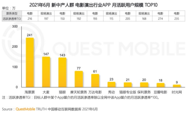 据观研天下数据显示,我国舞台剧行业市场规模从2014年到2019年逐年增长,从38.54亿元增长至54.29亿元,复合年增长率为7.09%;2020年同比下降56.46%,仅为23.64亿元。根据该机构预测,2021年中国舞台剧市场将增至55.24亿元。上海作为中国戏剧产业发展地标性城市,相关数据也具有风向标作用。据上海市演出行业协会统计,2021年上半年,上海专业剧场共演出3,936 台,较疫情前2019年同期增长2%,其中主、合办演出2,176场,占比55%,创历年新高。观众达到186万人次,演出收入共计3.8亿元,其中票房收入3亿元。另一方面,2021年的演出行业需求端发力明显。根据Quest Mobile数据显示,在2021年6月新中产人群电影演出行业APP月活跃用户数中,现场演出活跃渗透率为197万,仅次于电影216万。