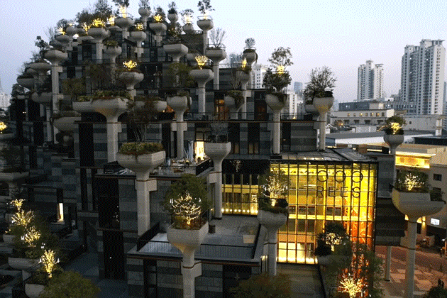 数百根清水混淋土立柱,毫不掩饰地从空中悬垂直下,仿佛巨根般扎入土地,连接着大地和空中的绿色生命,谱写着建筑与生命的史诗。