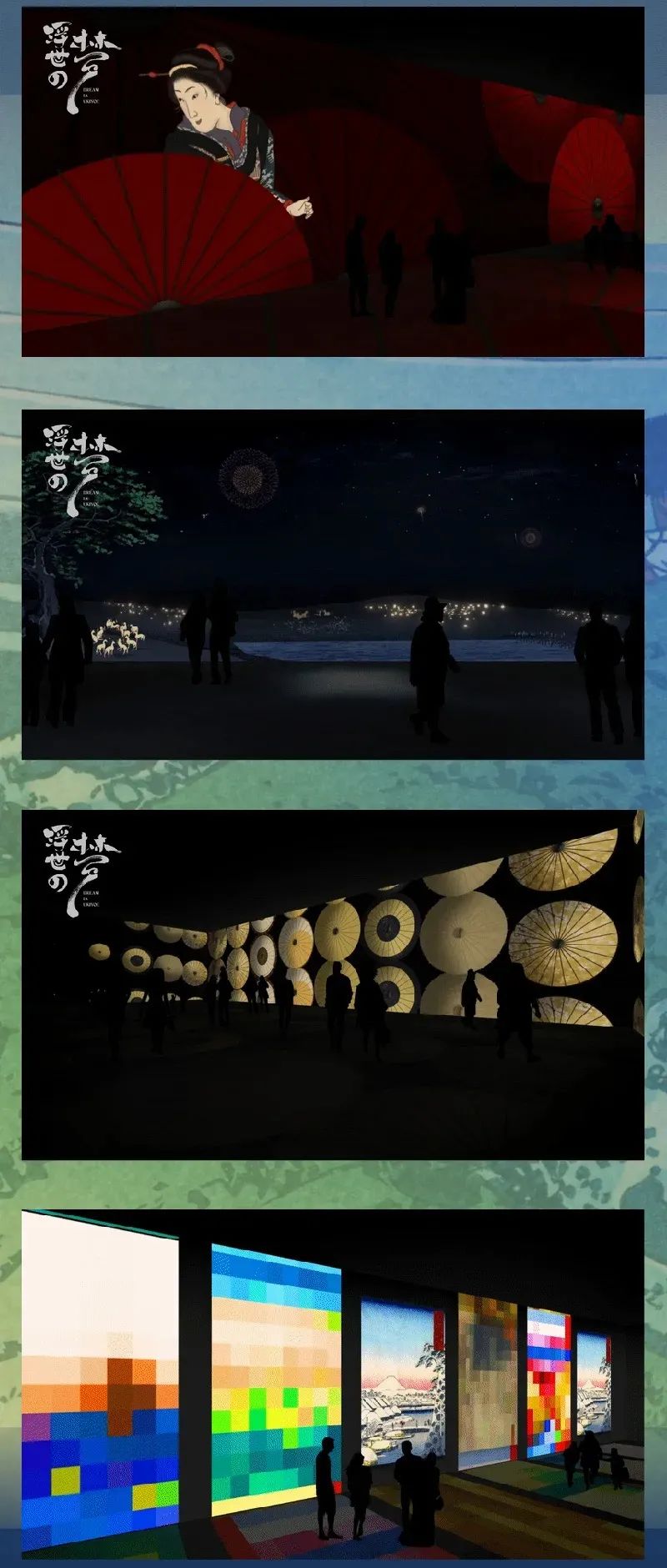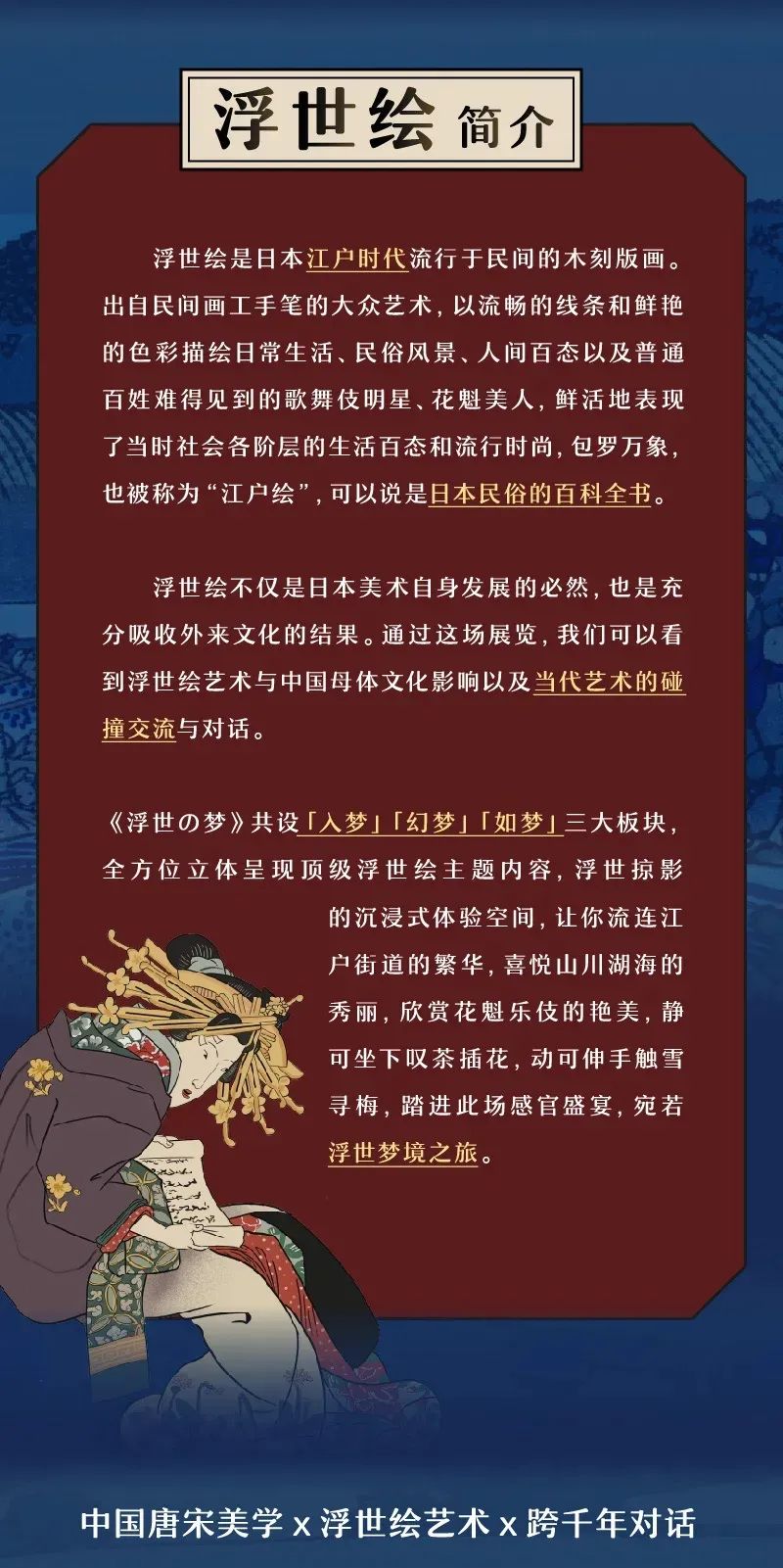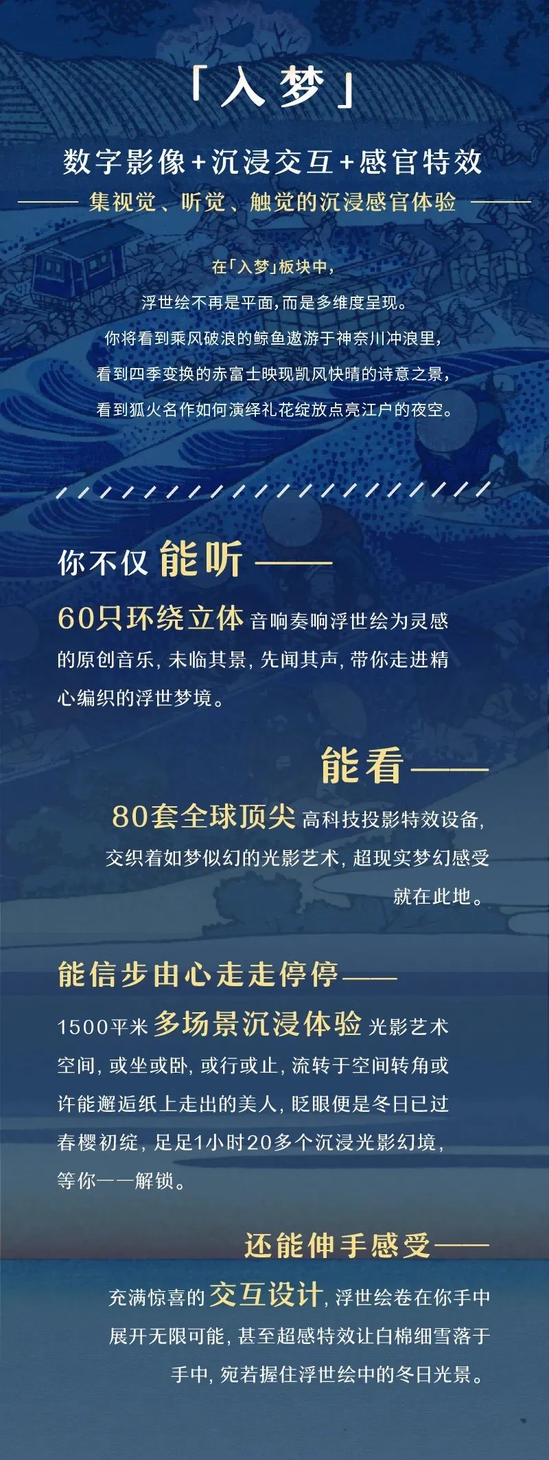 本次展览是一场集视觉、听觉、触觉、嗅觉、味觉于一体的多感官体验之旅,融合50多分钟原创数字艺术影像和原创音乐、近150幅浮世绘大师名作、80套高科技投影与特效设备、60多只环绕音响、2300平米全场景沉浸体验展览空间,深度呈现中国经典艺术、生活起居方式、著名文学作品、唐宋美学元素与浮世绘不同时期的艺术大师长达千年的历史渊源和300多年的时空对话,通过数字科技与艺术的交融创新,再现江户明治时代的人生百态、风情长物、自然风光、四季更迭与艺术成就,是迄今为止最大规模的5D沉浸浮世绘艺术展览。