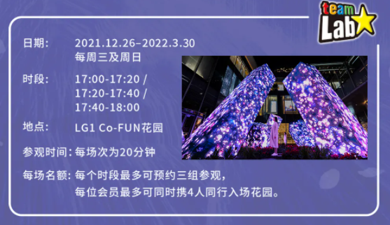 One ITC两周年携手teamLab呈现艺术作品《花园里的巨石群》,结合光影及自然园艺打造沉浸式艺术盛宴!本次呈现的全新作品——《花园里的巨石群》,由火遍全球的teamLab带来。来自不同时空的巨石群,矗立在花园里。巨石群会把绽放在当地、一年四季的各种花朵,通过一个小时的时间来不断循环呈现它们从诞生到凋零的过程。当人们在巨石附近移动时,花朵会凋零飘散。当人们静止伫立时,花朵会更尽情地绽放。而作为当地代表性的花卉,白玉兰也将呈现在作品空间。观者存在的现实时间、城市的时间、花朵的生死轮回,每一个不同的时间都有交集和重叠,让身体、城市和作品的世界连在一起。