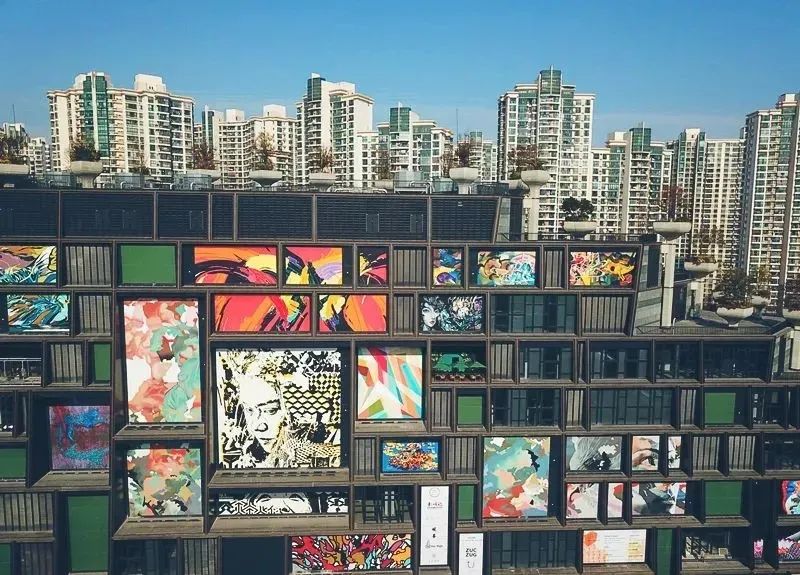 天安千树面向莫干山路的南立面,是一整面的“艺术巨幕墙”,16幅极具个性的巨型涂鸦。