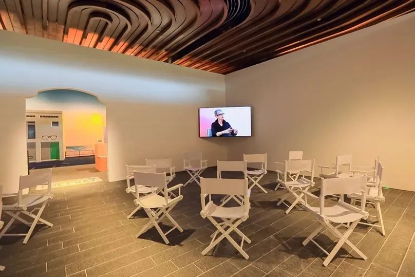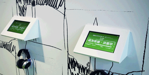 四层展厅的南侧特别设置了音乐体验区。在这里,观众可以带上耳机欣赏安迪·沃霍尔美术馆首席策展人何塞·卡洛斯·迪亚兹亲自挑选的与沃霍尔相关的音乐作品,以及UCCA基金会艺术公益大使许魏洲创作的展览推广曲《Stay By My Side》,或者坐在银色长椅上稍作休憩。
