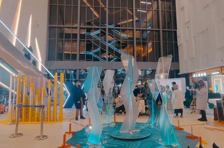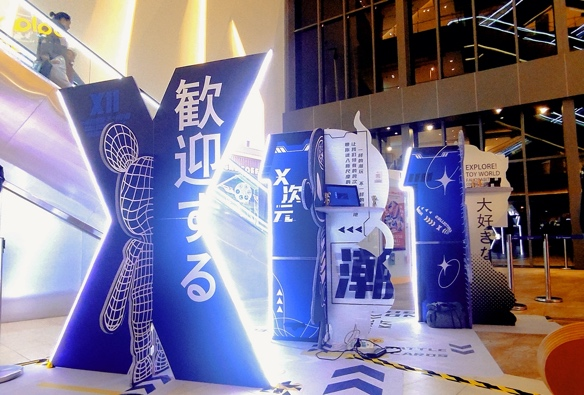 由X11品牌名称与盲盒造型结合诞生的整块阳光板插接而成的快闪空间,深蓝透光材质、亮色led灯带,打造特有的跨次元未来感场地,带你进入新尺度的潮玩虚拟空间。潮玩集合!参与互动墙,写下抽盒心愿,抽取属于你的镭射门票!