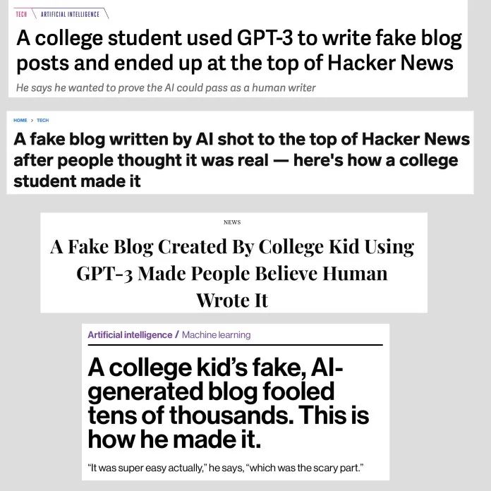 美国加州大学计算机系名叫 Liam Porr 的学生以假名“adolos”和用 GPT-3 生成的文章做自媒体,其第一篇文章「Feeling unproductive?Maybe you should stop overthinking」就登上了全球知名技术论坛「Hacker News」的榜首。