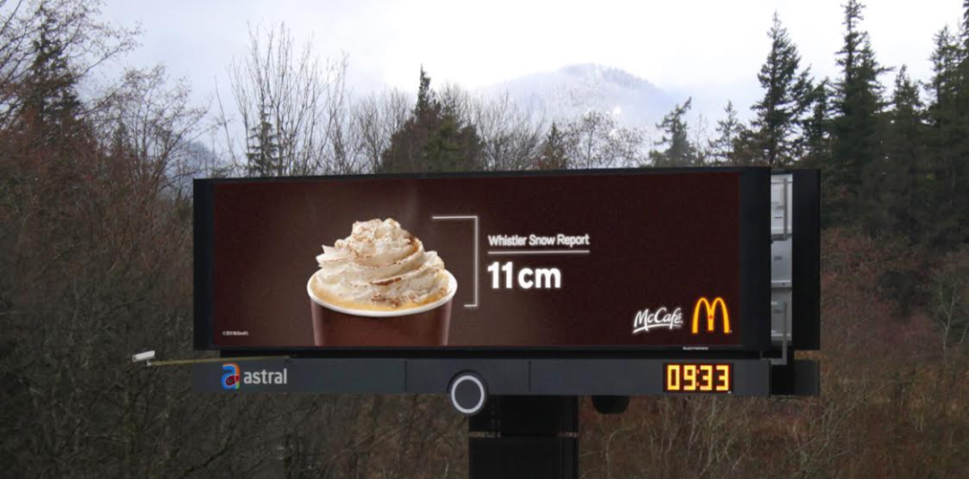 得益于科技的发展,数字户外广告还可以根据不同的触发条件来更加精准的定向受众及场景。除了根据受众旅程来制定不同策略和不同创意元素。根据如天气情况,大型活动,股市涨跌等来实时触发广告,也可以让每一分钱都花得其所。下雨天,开车的人会增多,人们会减少户外活动,更多的呆在室内,阴郁的心情会刺激消费的欲望,正是销售转化的好时机。天气晴朗时人们更倾向步行,心情也会更愉悦,对周边的信息更敏感,非常有利于唤起品牌意识。同样,股市的上涨会让人对非必需品产生更大兴趣,如汽车,奢侈品等等,股市下跌,受众会变得更加保守,会更加关注生活日用品。除了这些常见的触发条件,我们还可以根据品牌库存和其他特性来定制触发。比如某餐厅每当上座率低于75%的时候开始在全商场就餐时间段触发广告,饮料品牌在便利店投放广告时,每当库存低于20%就停止播放。