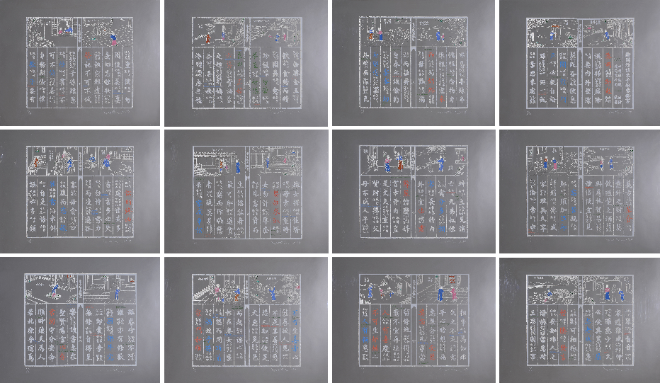 ▲ 《对照-朱子治家格言》,70x90cmx12,镜面不锈钢油彩,2018