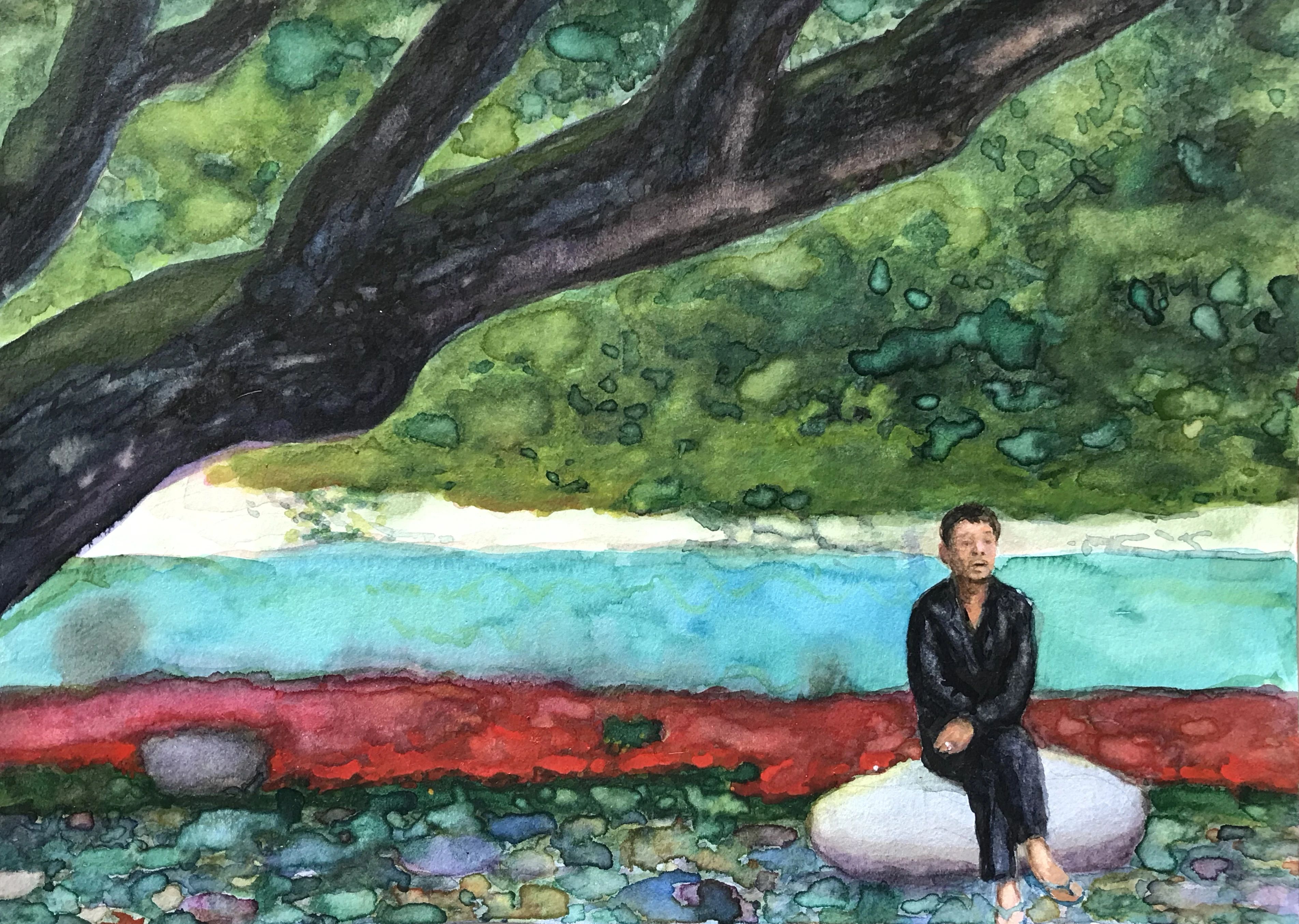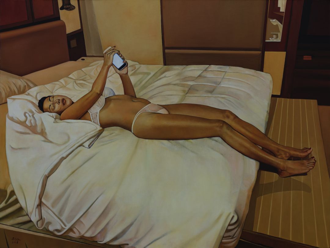 石冲的绘画,选择的是相当具象的方式。他把呈现一定姿势、表情的人体放置在各种象征性的场景中,这些姿势、表情和场景成为他的视觉语言。在有些并非“照相写实”的作品中,具体而微的笔触也凸显出来,成为他的语言。