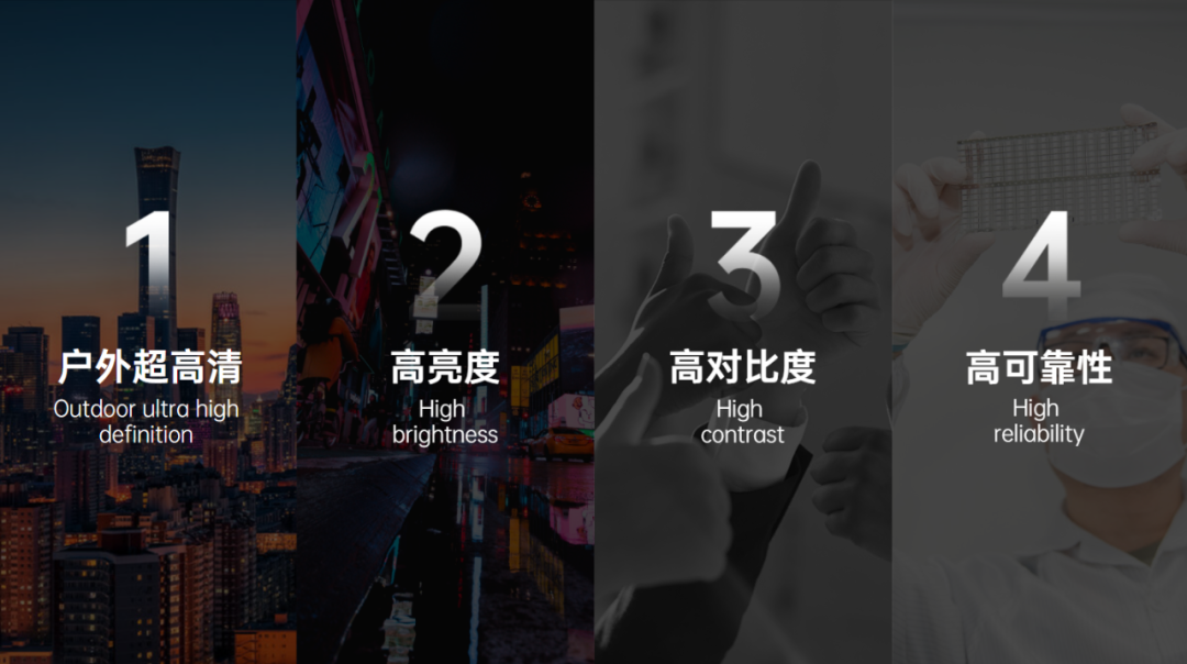 以上3大系列产品支持各类质保、应用亮度和高对比(B版)方案定制,不仅能满足户外超高清显示屏的亮度需求,还能凭借超高的对比度、整屏底色高度统一,给观众带来极致的视觉盛宴。
