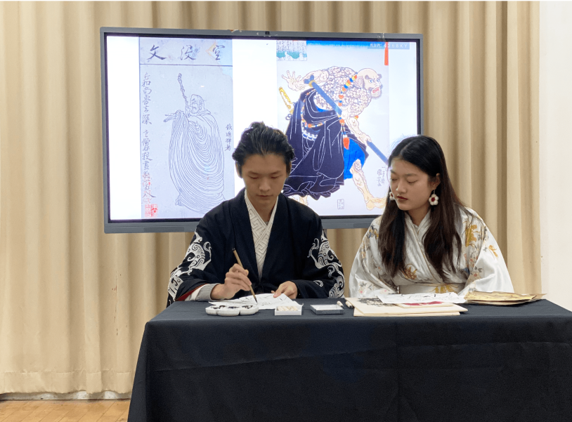 水浒叶子创始人陈洪绶有个朋友叫周孔嘉,恰逢变故,穷困潦倒。为了接济他,陈洪绶绘制了一套水浒人物画。《水浒传》在17世纪传入日本,冈岛冠山在京都完成了《通俗忠义水浒传》,这是第一本《水浒传》的日译本。随后,水浒热在日本逐渐盛行,日本江户时期的著名浮世绘画家葛饰北斋为之增加插图。他从陈洪绶的艺术中吸取了大量的精华和技巧,形成了自己独树一帜的绘画风格。由他改编的漫插画在日本风靡一时。而当葛饰北斋在暂住曲亭马琴家时,他与曲亭马琴产生了丰厚的友谊,经常交流艺术上的观点,也为曲亭马琴的作品绘制了许多插画,最具有代表性的就是曲亭马琴的创世之作《八犬传》。在葛饰北斋为《八犬传》创作插画时,他与陈洪绶在梦中相遇,葛饰北斋向陈洪绶讲述了在日本的“水浒热”。