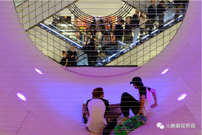 美国芝加哥建筑事务所MANA与滑板运动员Scott Oster合作,2019年在Le Bon Marché(乐蓬马歇百货公司)的中庭设计并安装了一个镜面滑板坡道。整个管道被称为“Le Cube”,被包裹在一个银色的盒子里,创造了一个圆柱形空间的错觉。