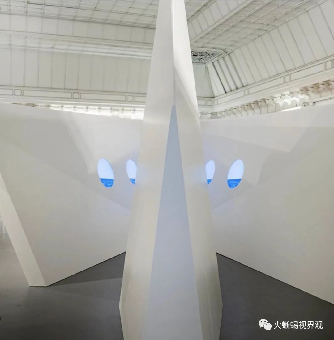 作品的第一部分,是百货商店的窗户,这让人联想到冰川的融化。一旦进入中庭,天花板上悬挂的两座巨大冰山表明这个地方已经完全被“淹没”在水下。这两座冰山由银色织物制成,长度超过2米,构成作品的第二部分。装置作品的第三部分,也是最后一部分,是一艘17米乘8米的白色船,形状像艺术家在我们小时候做的纸船——有点像诺亚方舟——它散发着希望。