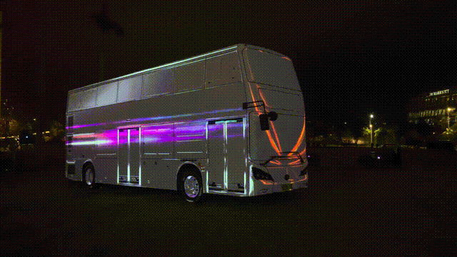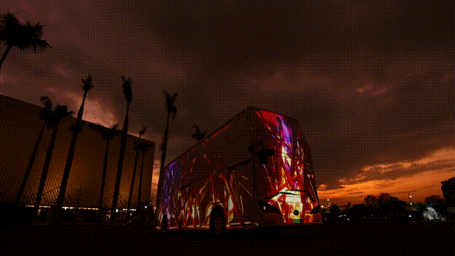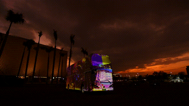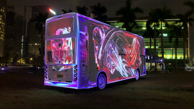 360度的数字雕塑,运用光影、色彩流动和速度,创造沉浸式体验。视觉元素收入巴士的现实框架之中,逐渐在人工与有机自然、几何、数字与现实之间穿越,引领人们进入真实与幻影、现实与虚拟无边界的世界。