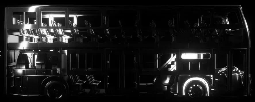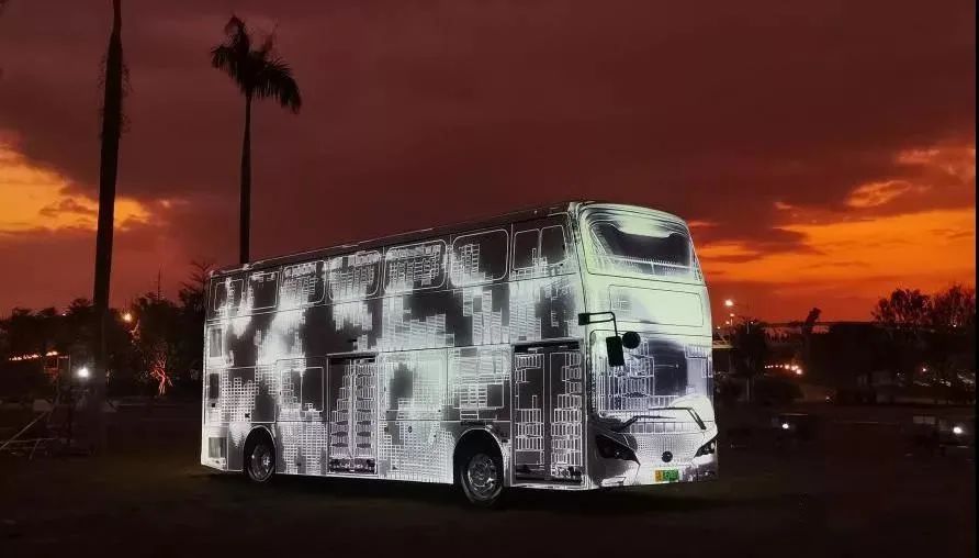 光在车厢内流动,唤醒了沉睡的巴士。光影交错下,人们清晰看到巴士的外部与内部空间。这是现实生活中的巴士。