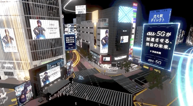 虚拟涩谷的街头随处可见《攻壳机动队》的海报与宣传,这是虚拟涩谷的未来 5G 娱乐项目之一。