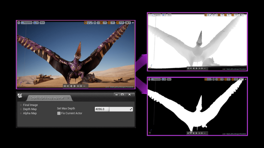 我想介绍的第一个插件是图层导出器。虚幻引擎通常使用延迟渲染方法,因此许多图像缓冲区都可以通过虚幻编辑器的“缓冲区可视化”菜单进行查看和调出。Cryptomatte输出功能是在虚幻引擎4.26中引入的,在《龙甲合体》的制作期间,这项功能尚未得到支持。因此,我们开发了一个使用自定义模板缓冲区(就是下图所示的模板缓冲区)的单独插件,这样美术师就能轻易地获得所需的图像缓冲区。图层导出器插件让任何人都可以生成所需的缓冲区,显著提高了工作效率。
