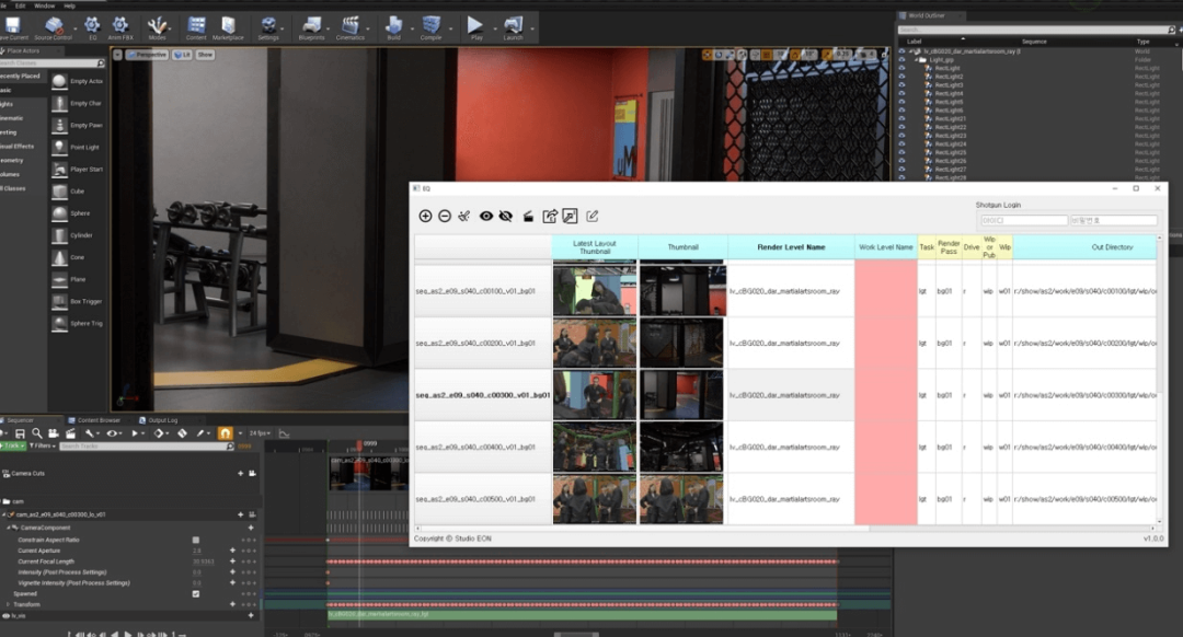 此外,使用虚幻引擎渲染项目的大部分镜头时,都需要创建和渲染大量Sequencer文件。因此Studio EON使用Unreal Python和外部PyQt包开发了一个批量渲染管理器,当批量渲染多个Sequencer文件时,可以选择性地只生成所需的渲染层。由于在渲染大量序列时,仅仅是打开和渲染文件就要耗费大量时间,批量渲染管理器能够缩短这一流程,大大提高了美术师的效率。
