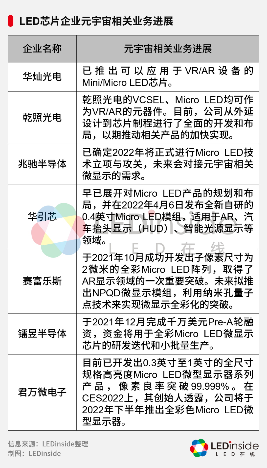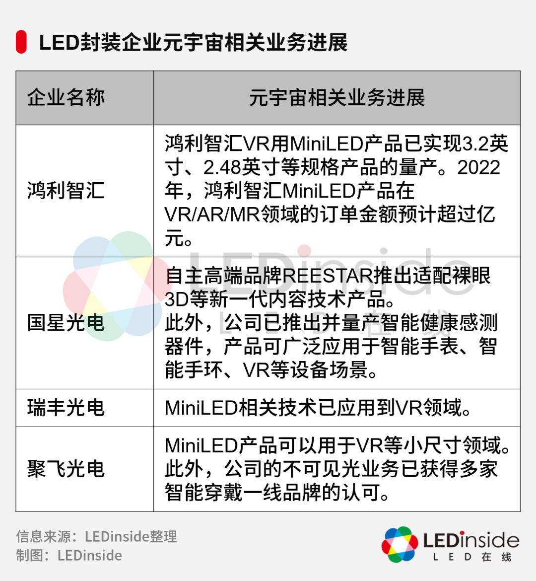 昔日,Facebook更名为“Meta”,为元宇宙的热度添了把柴。Meta CEO Mark Zuckerberg在更名时还表示,“这(元宇宙)将是继移动互联网之后,互联网发展下个篇章的重要组成部分。”然而,被寄以厚望的元宇宙目前并没有为Meta带来惊喜。根据Meta披露的财报,其旗下负责元宇宙业务的部门Reality Labs在2021财年亏损101.9亿美元,而营收仅22.7亿美元。无独有偶,号称“元宇宙第一股”的Roblox,其2021财年的营收为19.19亿美元,与2020财年相比增长108%;净亏损为4.91亿美元,而2020年净亏损为2.53亿美元——营收翻倍增长,亏损缺口却扩大了。中国的元宇宙概念股,也频频出现亏损或业绩下滑:中青宝2021年亏损4,622.61万元;商汤的净亏损从2020年的121.58亿元,扩大到2021年的171.77亿元;完美世界虽然在2021年实现归属于上市公司股东的净利润为37,117.75万元,但同比2020年的154,850.34万元,仍下降76.03%。另一方面,来自政府监管层面的影响,也让元宇宙的发展“遇冷”:2021年12月23日,中央纪委国家监委网站在《元宇宙如何改写人类社会生活》一文中提示,随着元宇宙话题大热,一些利用相关概念“圈钱”的套路也层出不穷,目前可能存在资本操纵、舆论吹捧、经济风险等多种风险;2022年2月18日,银保监会发布《关于防范以“元宇宙”名义进行非法集资的风险提示》,指出:一些不法分子蹭热点,以“元宇宙投资项目”“元宇宙链游”等名目吸收资金,涉嫌非法集资、诈骗等违法犯罪活动。这也是元宇宙在国内的第一道监管指令;2022年2月22日,《元宇宙产业自律公约》正式发布,《公约》明确提出要坚决抵制利用元宇宙热点概念进行资本炒作,避免形成市场泡沫。此外,2022年2月21日,国家知识产权局表示,商标数据库中约有1.6万余件“元宇宙”“METAVERSE”相关商标申请。国家知识产权局依据《商标法》及其有关条例规定,依法对“元宇宙”“METAVERSE”相关商标注册申请予以审查。国家知识产权局还特别指出,坚决反对、严厉打击“蹭热点”和不以使用为目的囤积等商标恶意注册行为。据悉,包括小红书元宇宙、爱奇艺奇遇元宇宙、探探元宇宙等在内的商标申请,均已被驳回复审。从资本市场到政府部门的监管,元宇宙的发展似乎被泼了一盆冷水。那么,事实确实如此吗?元宇宙有聚集关注度、融合多产业共同发展的积极作用,也有容易产生泡沫的消极的一面,这需要辩证地看待。此外,元宇宙的普及速度不可能会快,其在资本市场表现不理想是一种正常现象,而政策的监管有利于让元宇宙在发展和安全之间找到平衡点。故此,“冷水”此时泼来,恰是给元宇宙的发展带来一个“冷思考”,让人们理性看待元宇宙的未来与当下之间的差距,不过度消耗元宇宙的热度,让元宇宙从“虚火”走向“实火”。以LED企业为例,元宇宙已经成为全产业链共同的赛道,相关企业正在自身原有的赛道上,实实在在地通过相关的技术、产品及解决方案,积极触摸元宇宙。元宇宙的一大特色,是“沉浸感”。基于此,不管是VR/AR设备,还是可以带来虚实交融体验的大屏,都成为LED企业关注的焦点。LED芯片企业普遍认为,Mini背光和Micro LED技术将会被大规模运用到VR/AR设备。其中,Mini背光技术主要应用于中低阶VR产品,而Micro LED在对比度、反应时间、能耗、可视角度、分辨率等各方面表现优异,是VR/AR设备最佳的显示技术之一,但受限于技术及成本,现阶段主要出现在概念产品中。目前,LED芯片企业正积极探索Mini/Micro LED技术在元宇宙中的应用:封装端企业在看好Mini/Micro LED显示技术在元宇宙下的应用前景的同时,也纷纷指出Mini/Micro LED当下所面临的主要挑战。其中,瑞丰光电指出,OLED在高亮度、反应速度方面无法满足要求,VR/AR在后续的推广应用中亟需Mini/Micro LED技术的加持,而Mini/Micro LED面临的主要的挑战主要来源于成本。中麒光电进一步指出,Micro LED比较容易达到高亮度,但需要克服转移技术难题。晶科电子认为,Mini/Micro LED显示技术具有广阔的前景,成本、良率等是目前存在的主要挑战。其中,国星光电是国内首家自主开发出点间距0.3mm以下的玻璃基主动式驱动Micro LED全彩显示模组的单位,公司自主研制了高一致性像素化量子点色转换彩膜制备技术。而在MiniLED领域,其推出的IMD-M04器件是全球封装密度最高的MiniLED直显封装产品。鸿利智汇在设备、工艺等不同环节加紧布局,以期实现技术突破。其中,在设备方面,鸿利智汇认为转移设备是重中之重。鸿利智汇除了与日韩以及中国大陆、中国台湾转移设备企业合作外,还与华工大进行合作,目前已规划定制了巨量转移设备。兆驰光元则通过与下游显示客户以及科研单位合作,研究无衬底Micro LED巨量转移技术以及和透明TFT背板键合技术,预计在未来2-3年内可实现Micro LED显示产品的设计开发及小批试产。此外,晶科电子依托现有MiniLED技术平台,在Micro LED技术的高精度转移、涂覆等进行了技术布局;中麒光电拥有自主研发的专利巨量转移技术和全自动生产线,其巨量转移良率在2021年就已经达到99.999%……总之,封装端正在不断攻克Mini/Micro LED技术难题,并在元宇宙领域取得进展。与上游芯片、中游封装不同,显示屏企业在关注小尺寸屏幕在元宇宙时代的机遇的同时,也关注LED大屏所营造的虚实交融的世界,在元宇宙概念下的应用。其中,利亚德旗下多家子公司正在元宇宙领域进行全产业链布局。比如:虚拟动点是全球领先