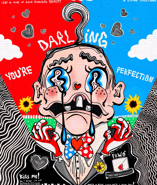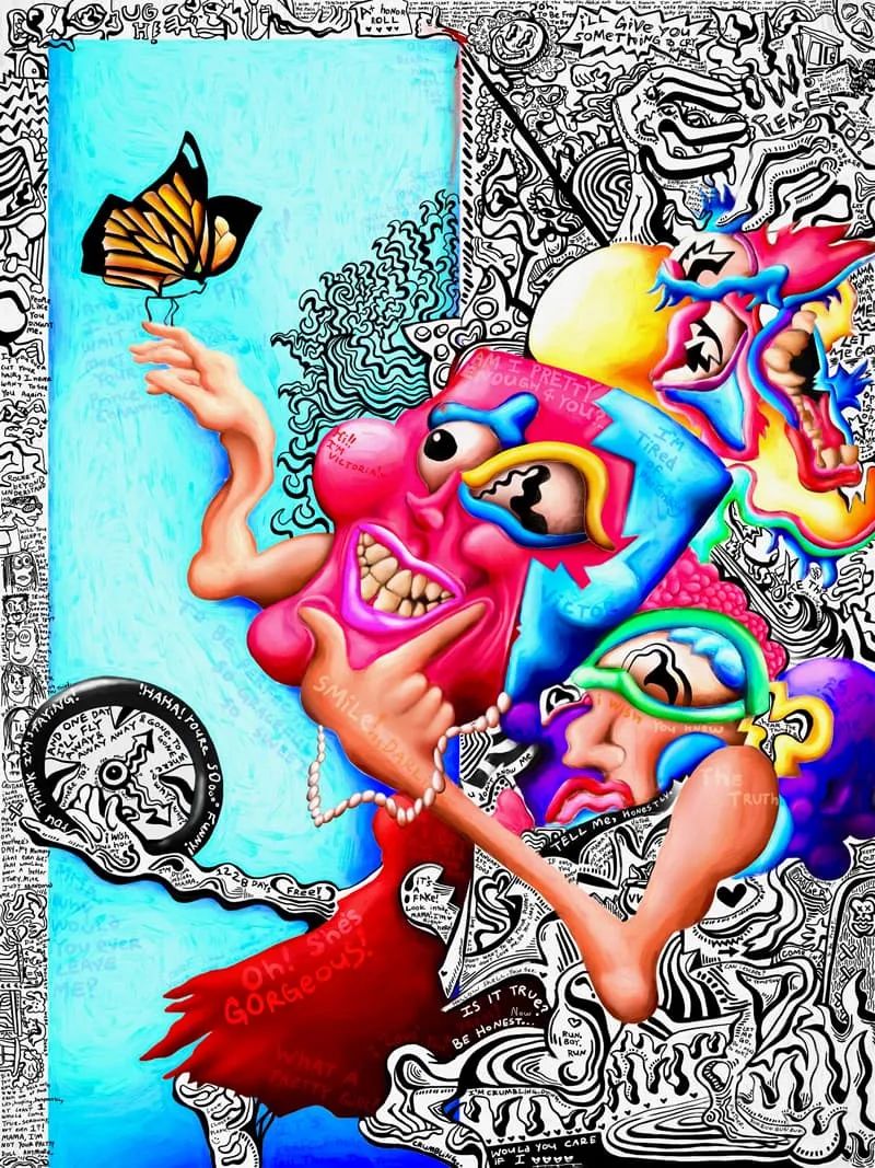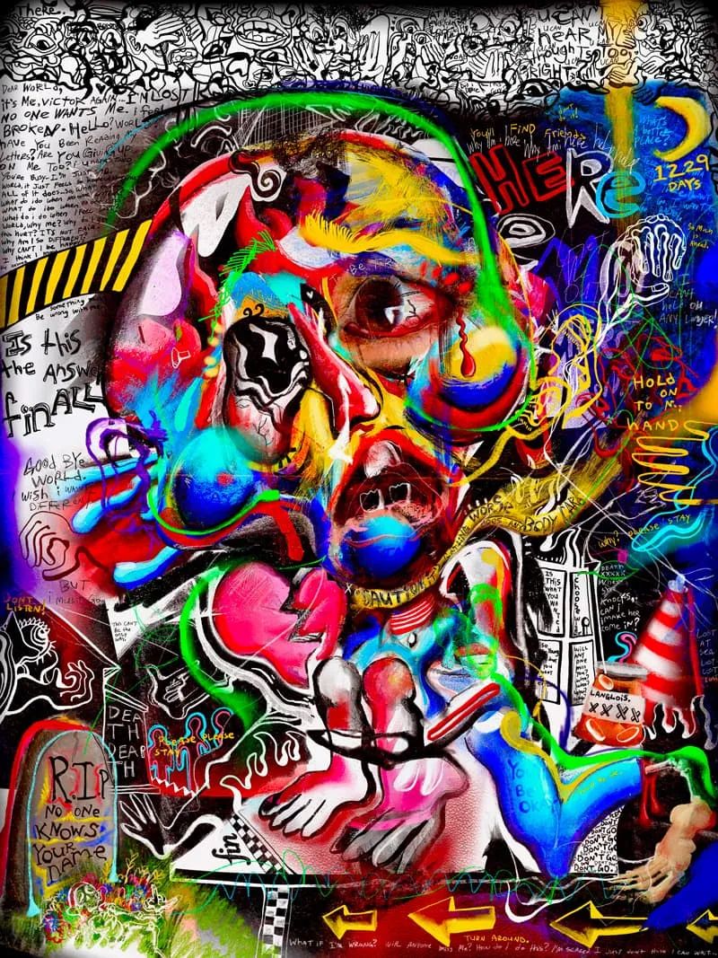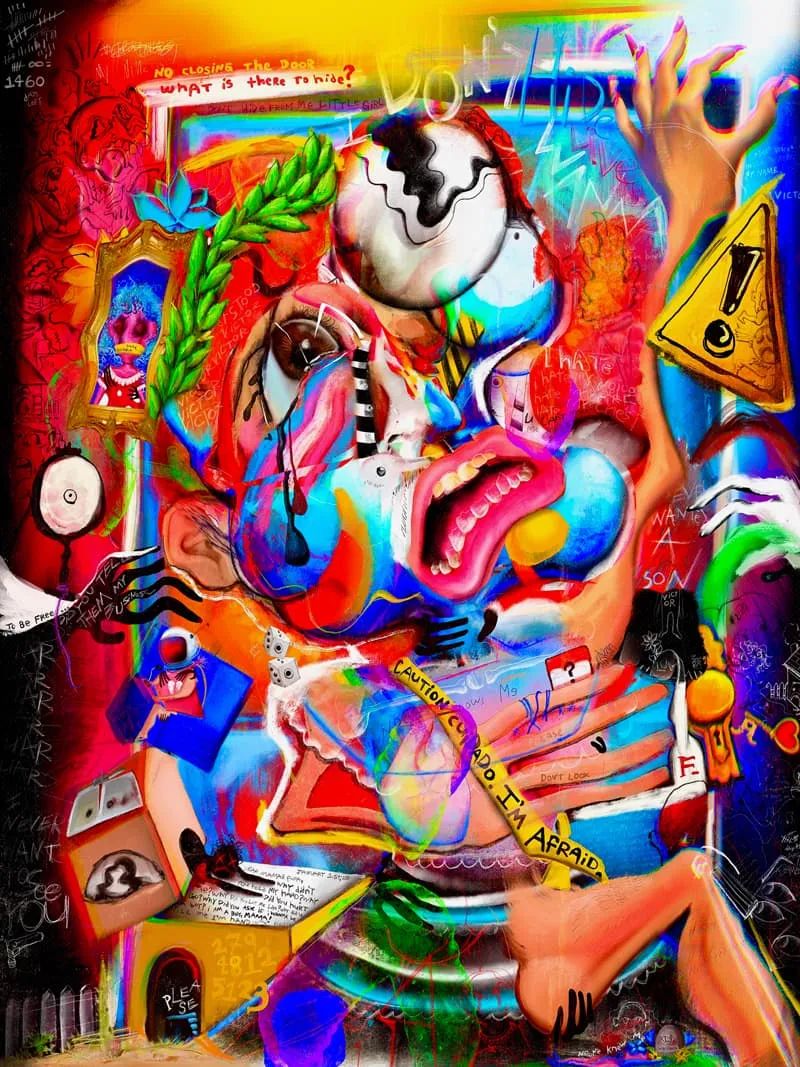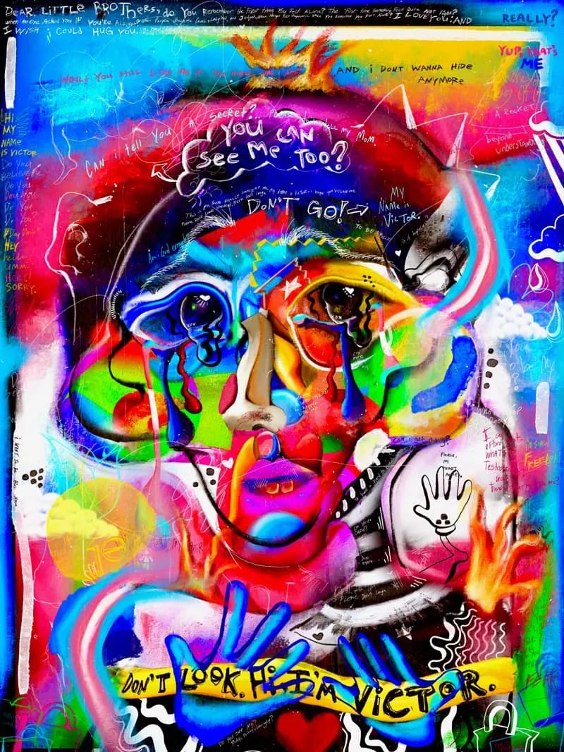 这个名声大噪的系列作品就是《你好,我是维克多(FEWOCiOUS),这就是我的生活》,其中的五幅作品记录了维克托在童年时期和性别转变时期的故事。这即是一个出柜的故事,也是一个“加冕典礼”——对于一个在地狱般的成长环境,并且奋战到今天的年轻艺术家来说,这是一项至高无上的成就!