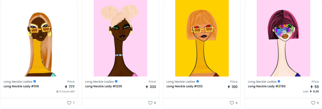 不仅如此她的《Long Neckie Ladies(长颈女士)》系列的市值已经超过 3,400,000 美元!目前该系列中最昂贵的 NFT 单件价格高达 777 ETH(约合 1,870,000 美元)!。